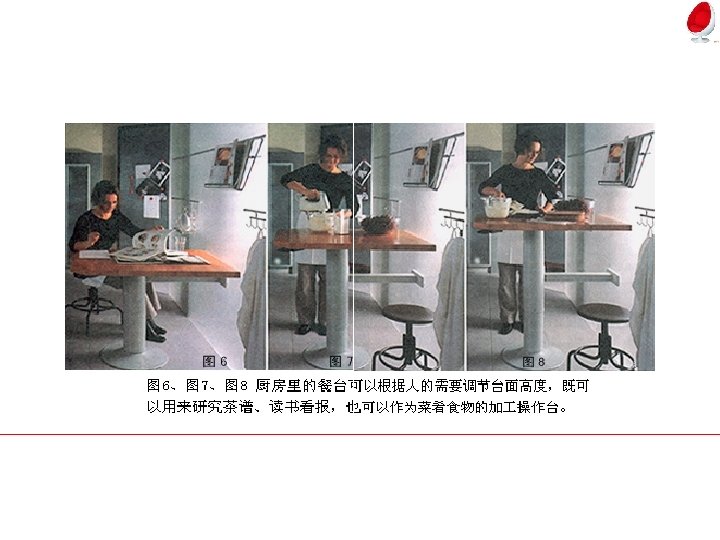 图 20:可升降置物架。 图 20:隐藏垃圾筒。 图 21:抽拉餐台。关上时就像一个抽屉,打开后既可以做餐台, 又可以做料理台。
