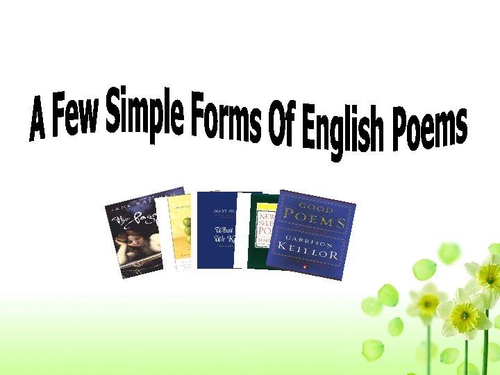 Fast reading Scan the passage and answer the following questions. 1. What is the main topic of the reading passage? different forms of English poems 2. What five kinds of poems does the reading passage talk about? nursery rhymes, list poems, cinquain, haiku, Tang poems.