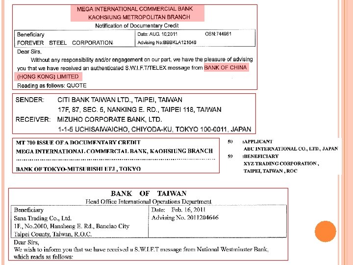 受貨人 (Consignee):如信用狀無規定以託運人為之 issued to, consigned to, made out to, TO ORDER = TO ORDER OF SHIPPER 託運人(Shipper, Consignor):通常為受益人 第三方單據(Third Party B/L):信用狀受益人以外之第三方為託運人
