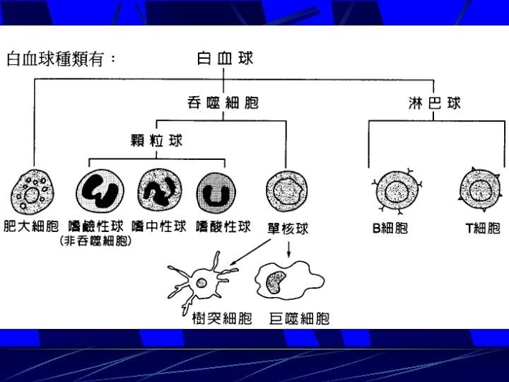 非吞噬細胞 三種非吞噬的白血球細胞是 嗜鹼性細胞(basophil)、嗜酸 性細胞(eosinophil)及淋巴細 胞(lymphocyte)