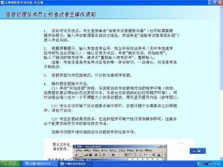 上 机 操 作 须 知 5、在答题过程中,单击某道题下方的“开始答题”按钮后,系统即应 该启动与试题相对应的程序(例如,如果题目要求用WORD完成某项任务, 系统会自动启动WORD应用程序环境),同时试卷会缩小成为一个可调整大 小的浮动题板,用来显示题目内容 ,答题过程中如需要其它应用程序,请 自行启动。 6、考生答题结果在当前程序环境中须及时执行保存操作(注意务必不能 更改保存文件的路径和文件名)。 7、答完所有试题并检查无误以后,单击屏幕上端“交卷”按钮,根据提 示检查答题数量,单击“确认”后即完成交卷。 8、在考试过程中,考生不能随意更改考试计算机的系统配置,不能执行 与考试无关的操作,否则将导致考试意外,其后果将由考生承担。 9、如遇到计算机系统故障,请举手向监考 作人员示意。