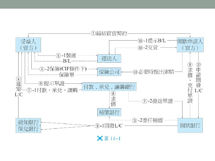 出口商 BENEFICIARY 墊 付 押 匯 款 辨 理 押 匯 進口商 APPLICANT 申 請 開 發 信 用 狀 通 知 信 用 狀 單 據 到 達 通 知 進 口 贖 單 開發、交付信用狀 通知銀行 ADVISING BANK 押匯銀行 NEGOTIATING BANK 寄單求償 開狀銀行 ISSUING BANK 償付押匯款項 claiming bank paying bank, drawee