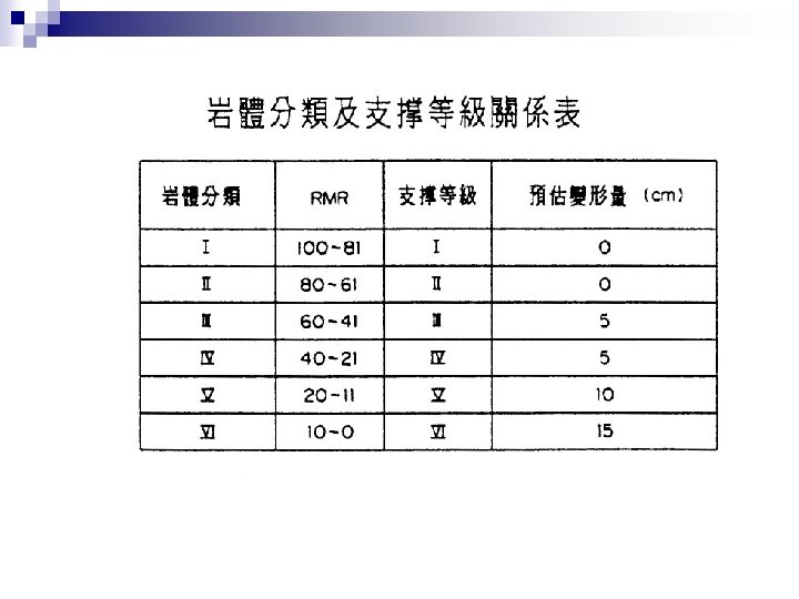 細部設計 隧道設計主要考慮之要素 1. 地質條件 2. 支撐系統 3. 施 方法 4. 通風 5. 輔助坑道 6. 監測計畫 7. 洞口位置 (線形 , 邊坡穩定 )/隧道間距 (穩定 , 用 地)