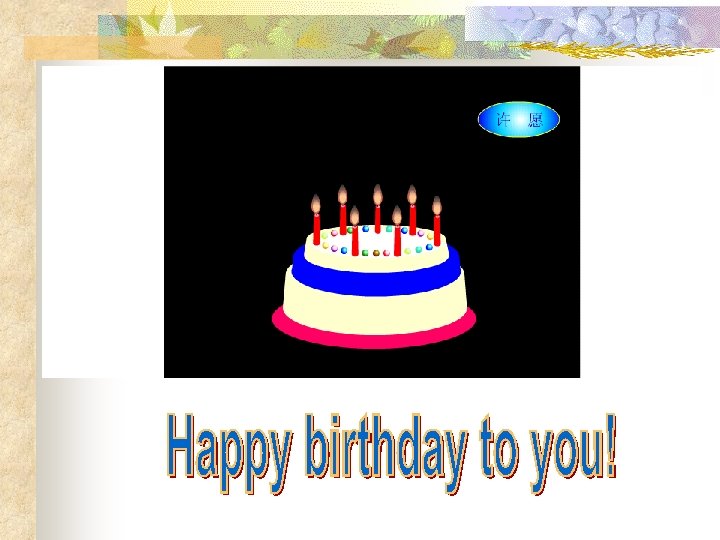 Choosing the phrases (选择正确答案): such as, make a wish, blow out, have a good time, talk about 1. Everyone comes to my party. We all _________ today. have a good time 2. Before Lucy cuts the cake, she must _______ 13 candles. blow out 3. Li Lei and Tom ________ an interesting film. talk about 4. I ________. I wish I have lots of money! make a wish 5. I go to many cities, ________ Beijing, Shanghai, Wuxi and such as Changzhou.