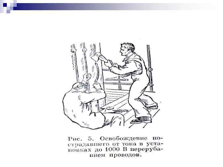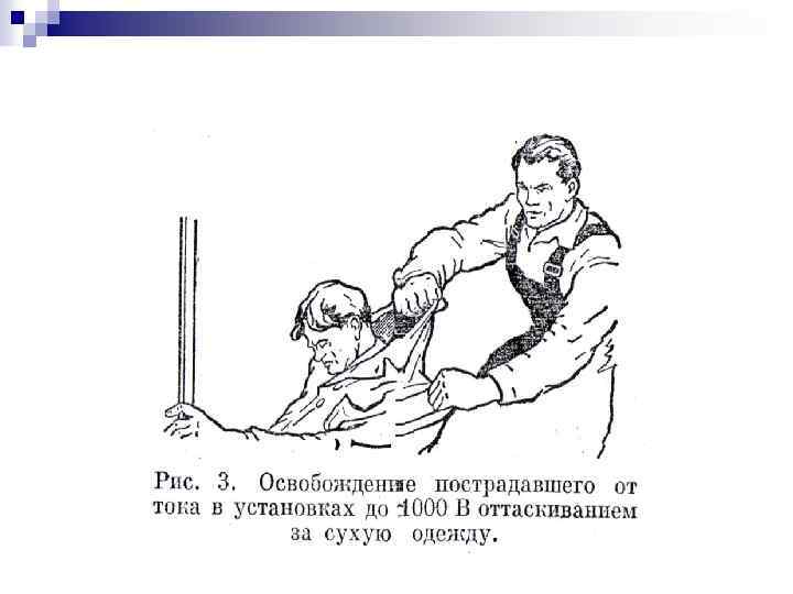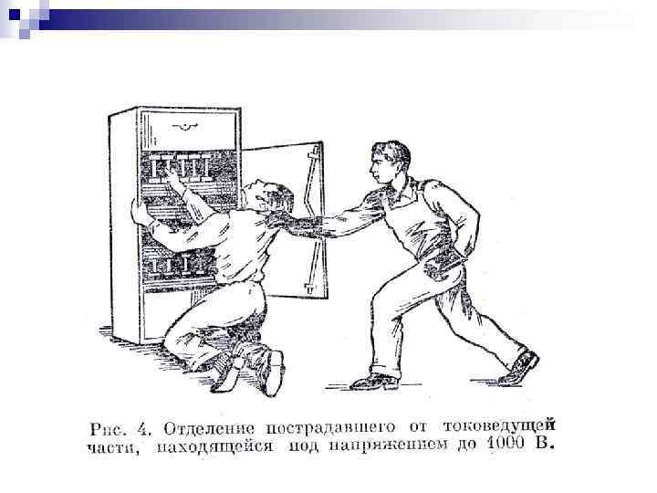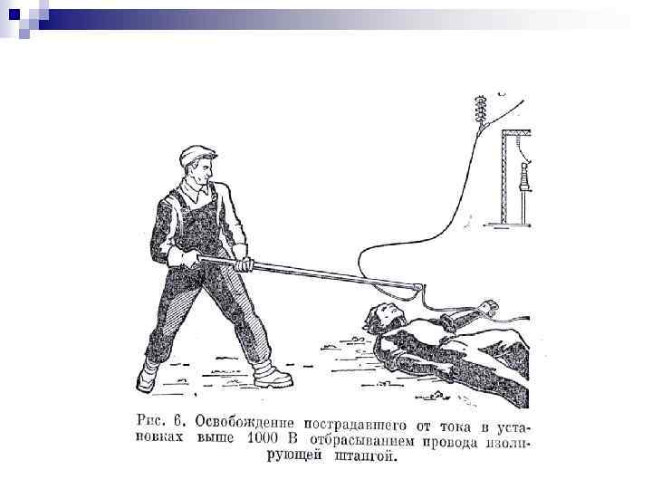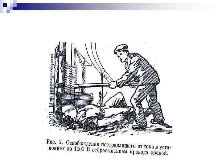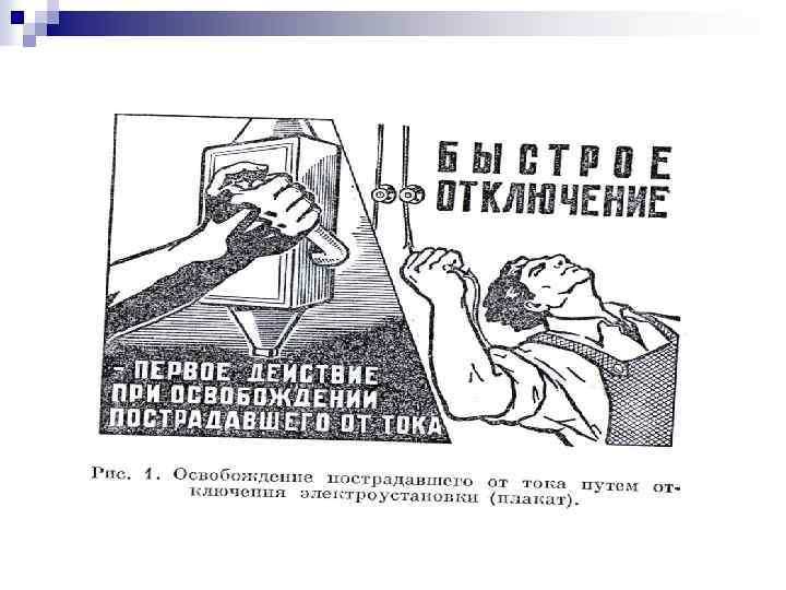 Запрещается: • выполнять любые работы на электроустановках, находящихся ближе одного метра от радиаторов отопления, водопроводных сетей; • эксплуатировать электроустановки персоналу, не прошедшему обучение, проверку знаний и не имеющего удостоверения о присвоении квалификационной группы по электрической безопасности. Помните, что опасность поражения электрическим током особенно велика в сырых помещениях, при наличии сырой и влажной спецодежды, обуви, мокрых рук, ног, токопроводящего пола. При поражении электрическим током кого–либо освободите его от действия током (сухим, нетокопроводящим предметом, оттащите за одежду, если она сухая и отстаёт от тела и т. п. ), если пострадавший не дышит и находится без сознания, необходимо немедленно приступить к оказанию помощи: массаж сердца и искусственное дыхание.