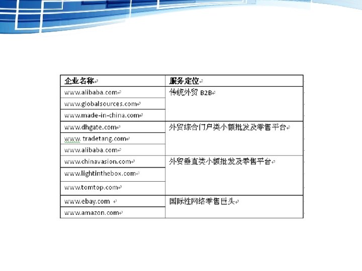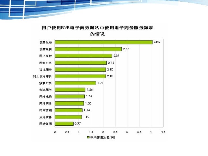 1 为企业营销提供服务 信息发布、信息提供、邮件营销、网络广告、咨询服务等 2 为企业采购原料提供服务 信息提供、网上信用评价、物流服务、网上支付等