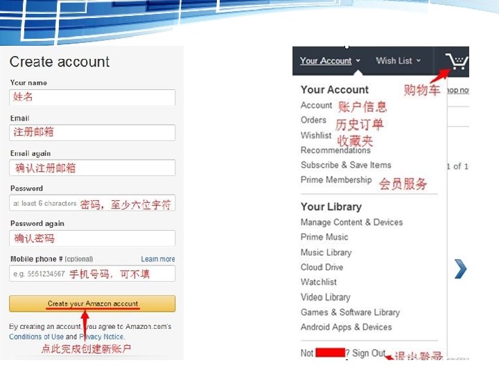 注册新账户 点击右侧“Your Account”你的账户下面的 “Start here”即可进入新账户注册页面。 “Sign in”是登陆按钮