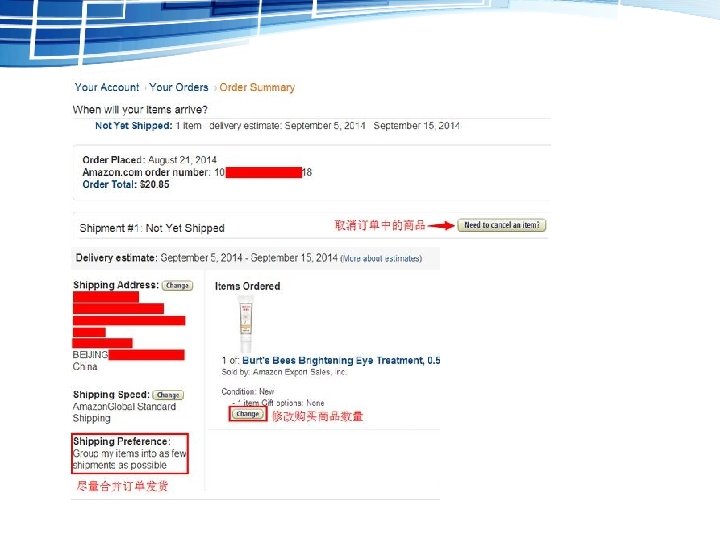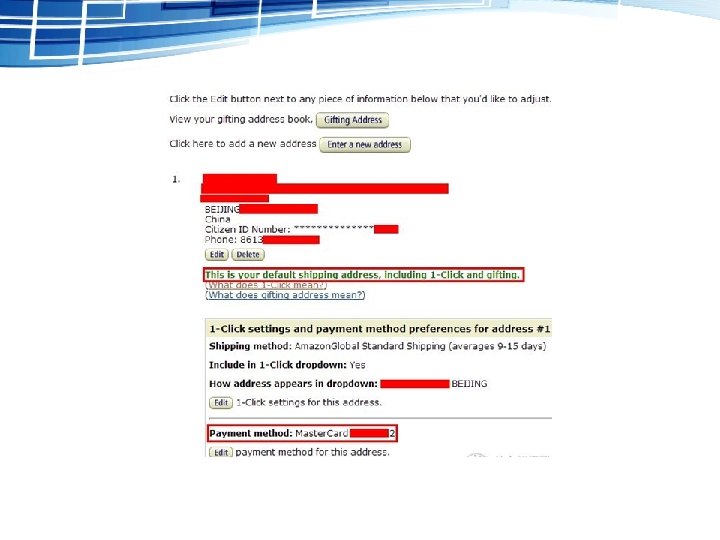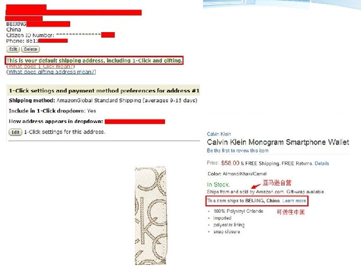 3. 输入直邮收货地址。添加 收货地址的页面如下图所示, 按照红字注释填写信息即可, 注意按照中文语序、用拼音 填写即可。邮编和联系电话 都需要准确填写,电话最好 留手机号码,并且要加中国 区号“ 86”。 如果是国内地址,则需在 “Country”一栏选择“China” 中国,选好之后,下方会自 动出现填写Citizen ID Number的输入框,在这里 填写收货人的身份证号码即 可。