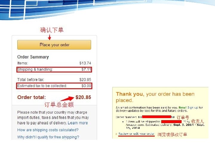 5. 确认各项购买信息之后,就可以确认订单了,在Review your order 预览订单页面右侧可以看到 Shipping & handling 运费、 Estimated tax to be collected 美国境内各州消费税、 Import Fees Deposit 预缴关税、 Order total 订单总金额等信息。