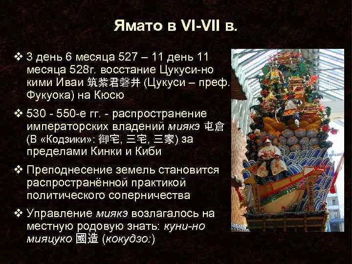 Ямато в VI-VII в. v 3 день 6 месяца 527 – 11 день 11 месяца 528 г. восстание Цукуси-но кими Иваи 筑紫君磐井 (Цукуси – преф. Фукуока) на Кюсю v 530 - 550 -е гг. - распространение императорских владений миякэ 屯倉 (В «Кодзики» : 御宅, 三家) за пределами Кинки и Киби v Преподнесение земель становится распространённой практикой политического соперничества v Управление миякэ возлагалось на местную родовую знать: куни-но мияцуко 國造 (кокудзо: )