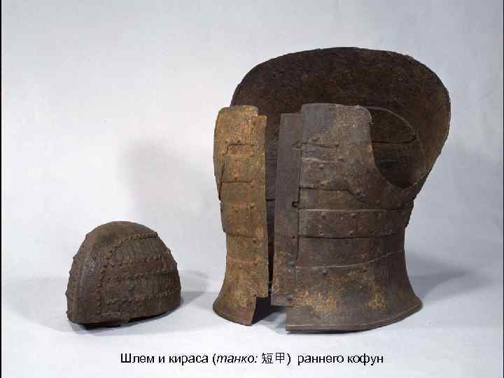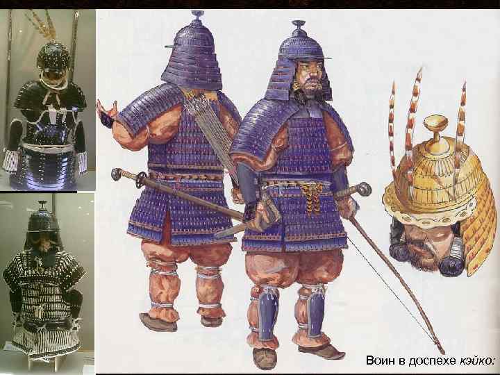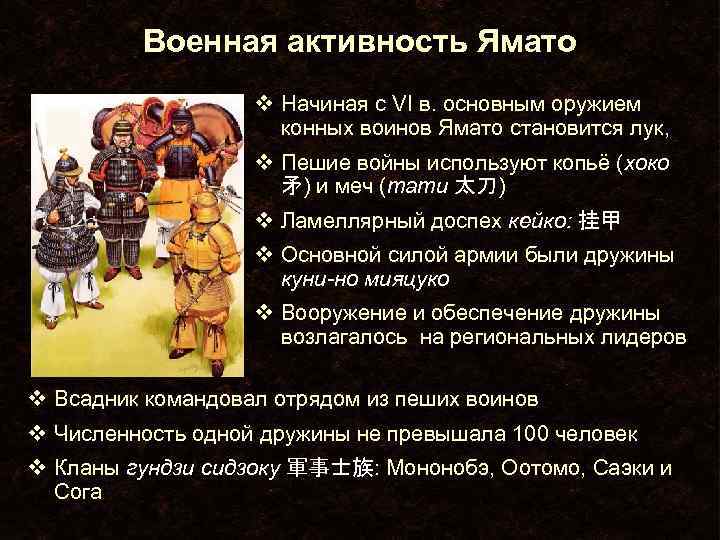 Военная активность Ямато v Начиная с VI в. основным оружием конных воинов Ямато становится лук, v Пешие войны используют копьё (хоко 矛) и меч (тати 太刀) v Ламеллярный доспех кейко: 挂甲 v Основной силой армии были дружины куни-но мияцуко v Вооружение и обеспечение дружины возлагалось на региональных лидеров v Всадник командовал отрядом из пеших воинов v Численность одной дружины не превышала 100 человек v Кланы гундзи сидзоку 軍事士族: Мононобэ, Оотомо, Саэки и Сога