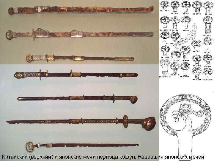 Китайский (верхний) и японские мечи периода кофун. Навершия японских мечей