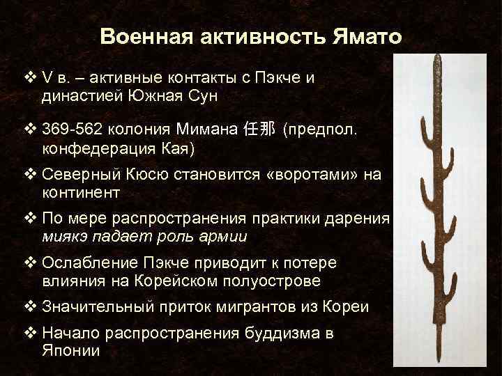 Военная активность Ямато v V в. – активные контакты с Пэкче и династией Южная Сун v 369 -562 колония Мимана 任那 (предпол. конфедерация Кая) v Северный Кюсю становится «воротами» на континент v По мере распространения практики дарения миякэ падает роль армии v Ослабление Пэкче приводит к потере влияния на Корейском полуострове v Значительный приток мигрантов из Кореи v Начало распространения буддизма в Японии