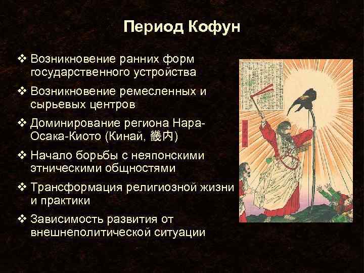Период Кофун v Возникновение ранних форм государственного устройства v Возникновение ремесленных и сырьевых центров v Доминирование региона Нара. Осака-Киото (Кинай, 畿内) v Начало борьбы с неяпонскими этническими общностями v Трансформация религиозной жизни и практики v Зависимость развития от внешнеполитической ситуации