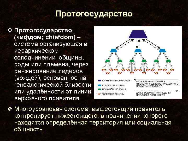 Протогосударство v Протогосударство (чифдом; chiefdom) – система организующая в иерархическом соподчинении общины, роды или племена, через ранжирование лидеров (вождей), основанное на генеалогической близости или удалённости от линии верховного правителя. v Многоуровневая система: вышестоящий правитель контролирует нижестоящего, в подчинении которого находятся определённая территория или социальная общность