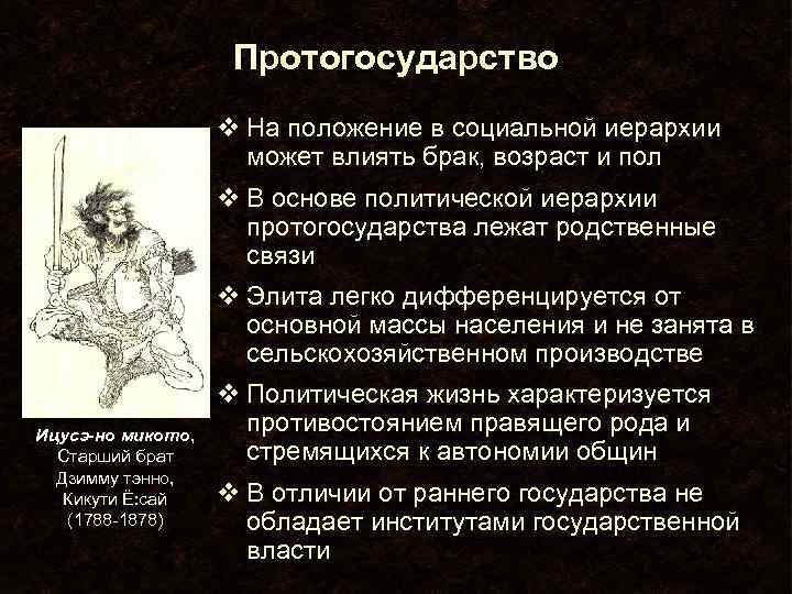 Протогосударство v На положение в социальной иерархии может влиять брак, возраст и пол v В основе политической иерархии протогосударства лежат родственные связи v Элита легко дифференцируется от основной массы населения и не занята в сельскохозяйственном производстве Ицусэ-но микото, Старший брат Дзимму тэнно, Кикути Ё: сай (1788 -1878) v Политическая жизнь характеризуется противостоянием правящего рода и стремящихся к автономии общин v В отличии от раннего государства не обладает институтами государственной власти
