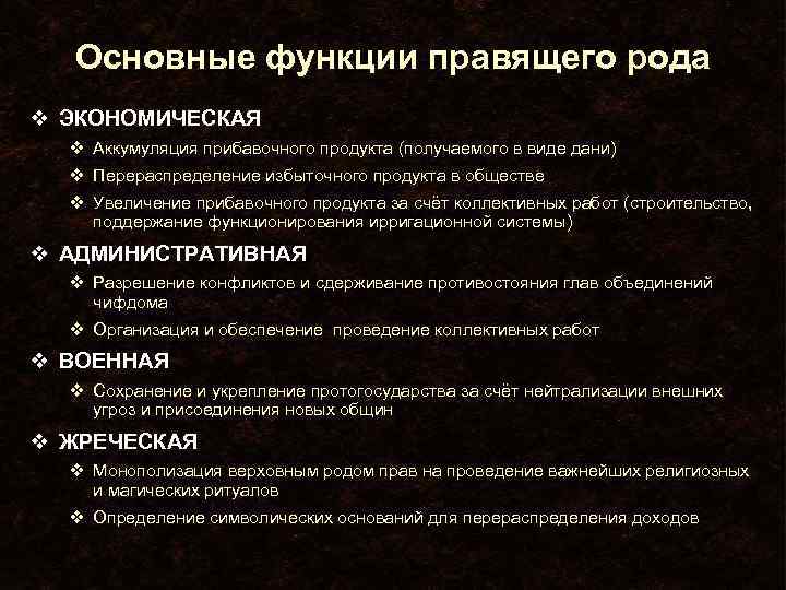 Основные функции правящего рода v ЭКОНОМИЧЕСКАЯ v Аккумуляция прибавочного продукта (получаемого в виде дани) v Перераспределение избыточного продукта в обществе v Увеличение прибавочного продукта за счёт коллективных работ (строительство, поддержание функционирования ирригационной системы) v АДМИНИСТРАТИВНАЯ v Разрешение конфликтов и сдерживание противостояния глав объединений чифдома v Организация и обеспечение проведение коллективных работ v ВОЕННАЯ v Сохранение и укрепление протогосударства за счёт нейтрализации внешних угроз и присоединения новых общин v ЖРЕЧЕСКАЯ v Монополизация верховным родом прав на проведение важнейших религиозных и магических ритуалов v Определение символических оснований для перераспределения доходов