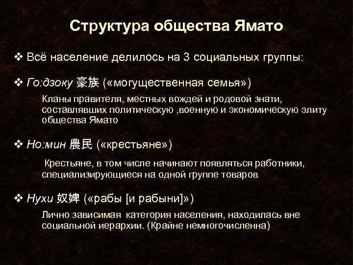 Структура общества Ямато v Всё население делилось на 3 социальных группы: v Го: дзоку 豪族 ( «могущественная семья» ) Кланы правителя, местных вождей и родовой знати, составлявших политическую , военную и экономическую элиту общества Ямато v Но: мин 農民 ( «крестьяне» ) Крестьяне, в том числе начинают появляться работники, специализирующиеся на одной группе товаров v Нухи 奴婢 ( «рабы [и рабыни]» ) Лично зависимая категория населения, находилась вне социальной иерархии. (Крайне немногочисленна)