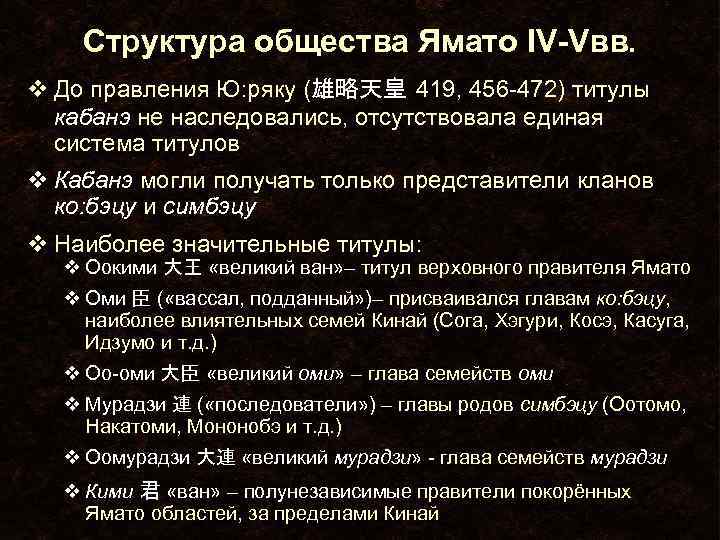 Структура общества Ямато IV-Vвв. v До правления Ю: ряку (雄略天皇 419, 456 -472) титулы кабанэ не наследовались, отсутствовала единая система титулов v Кабанэ могли получать только представители кланов ко: бэцу и симбэцу v Наиболее значительные титулы: v Оокими 大王 «великий ван» – титул верховного правителя Ямато v Оми 臣 ( «вассал, подданный» )– присваивался главам ко: бэцу, наиболее влиятельных семей Кинай (Сога, Хэгури, Косэ, Касуга, Идзумо и т. д. ) v Оо-оми 大臣 «великий оми» – глава семейств оми v Мурадзи 連 ( «последователи» ) – главы родов симбэцу (Оотомо, Накатоми, Мононобэ и т. д. ) v Оомурадзи 大連 «великий мурадзи» - глава семейств мурадзи v Кими 君 «ван» – полунезависимые правители покорённых Ямато областей, за пределами Кинай