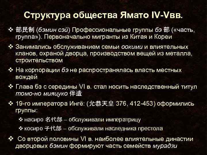 Структура общества Ямато IV-Vвв. v 部民制 (бэмин сэй) Профессиональные группы бэ 部 ( «часть, группа» ). Первоначально мигранты из Китая и Кореи v Занимались обслуживанием семьи оокими и влиятельных кланов, охраной дворца, производством вещей из металла, строительством v На корпорации бэ не распространялась власть местных вождей v Глава бэ с середины VI в. стал носить наследственный титул томо-но мияцуко 伴造 v 19 -го императора Ингё: (允恭天皇 376, 412 -453) оформились группы: v насиро 名代部 – обслуживали императрицу v косиро 子代部 – обслуживали наследника престола v Со второй половины VI в. наиболее влиятельные династии дворцовых бэмин формируют часть семейств мурадзи