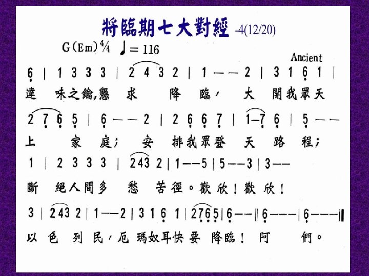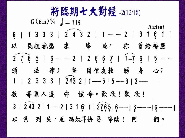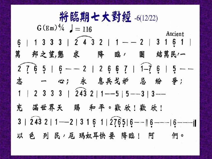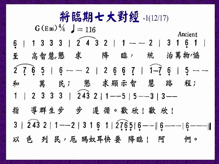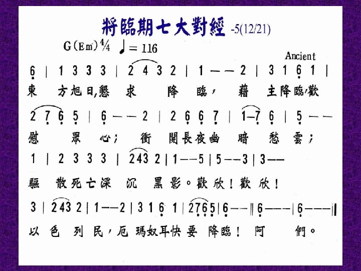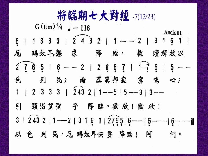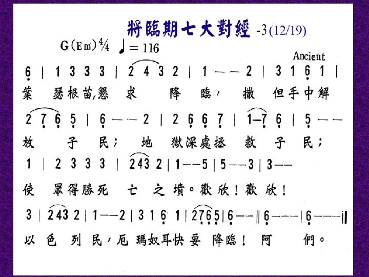 -「啊!厄瑪奴耳」 ( Emmanuel)。 O 12/23 • O Emmanuel, Rex et Legifer noster, exspectatio gentium, et Salvator earum, veni ad salvandum nos, Domine, Deus noster. • 啊!厄瑪奴耳(O Emmanuel),我們的君王和 立法者,列邦的期望,萬民的救主,我們的天 主。求你快來,救贖我們。(參看依 7: 14; 8: 8; 創 49: 10; 依 33: 22)