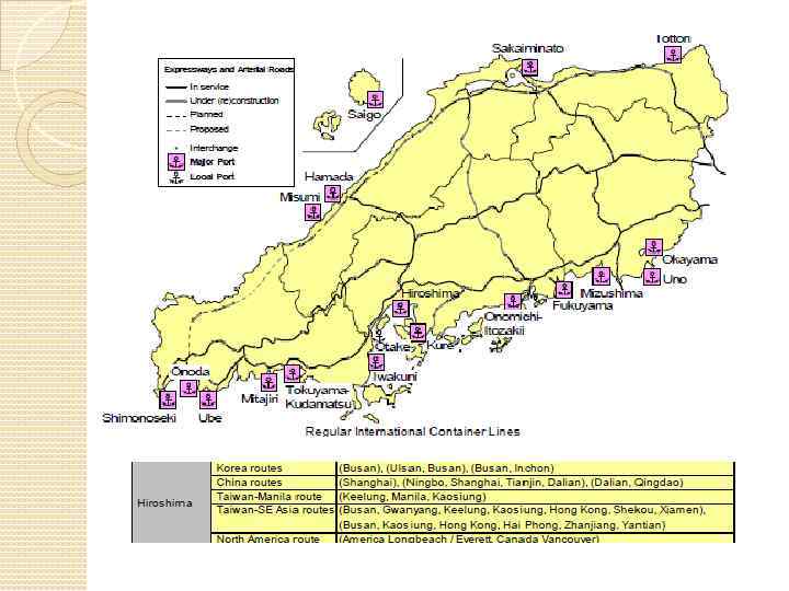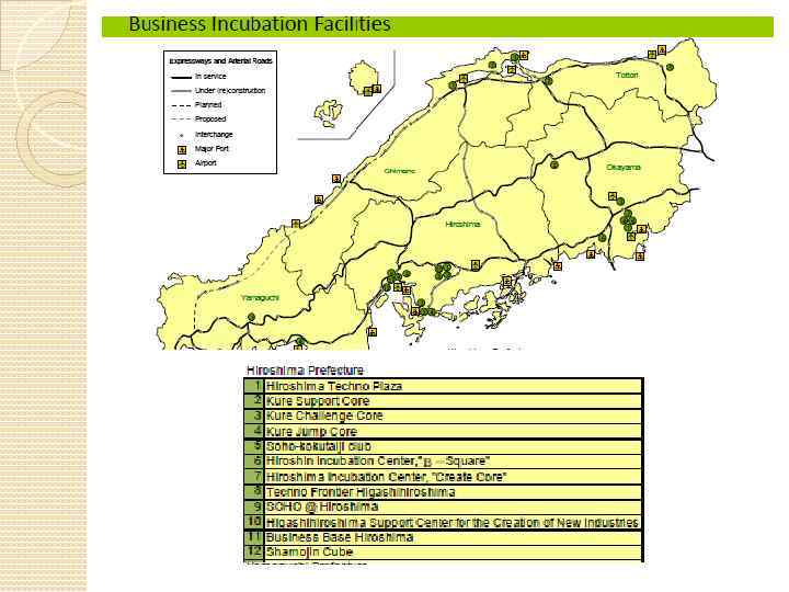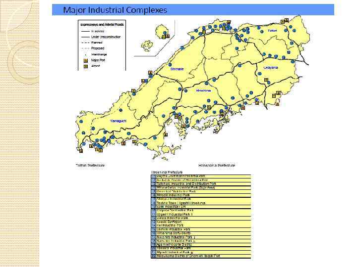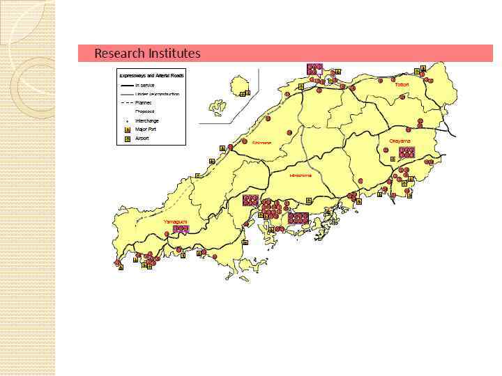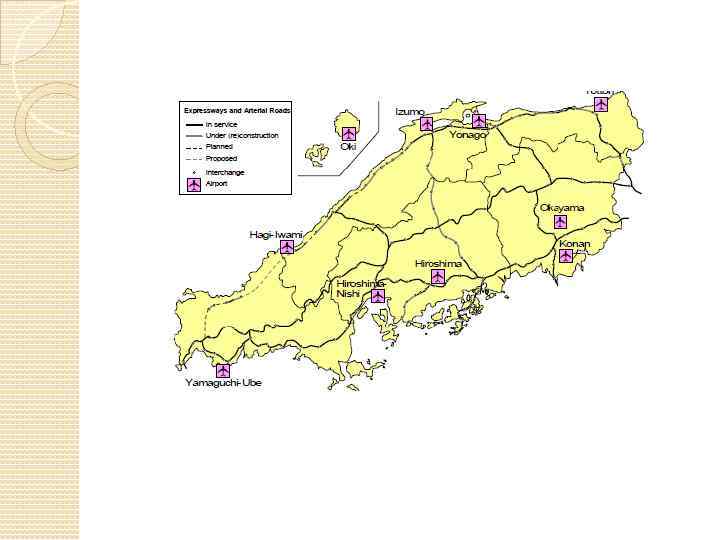 Население 2, 86 млн. ч Доля работоспособного населения 1, 4 млн Площадь 8, 480 km² ВВП 11, 515, 552 миллиона йен(143, 432 миллиона долларов) Транспортное машиностроение, металлургия, производство электротехнического оборудования, машиностроение, пищевая промышленность Охрана окружающей среды , медицина/соц. обеспечение, биотехнологии, телекомуникации, нанотехнологии (Офис Japan External Trade Organization в префектуре Хиросима) Лидирующие отрасли промышленности Развивающиеся отрасли промышленности JETRO offices