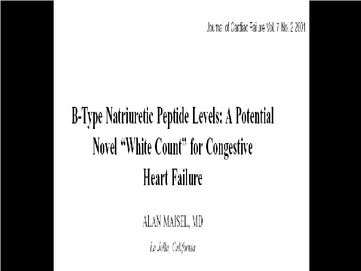 BNP在急性充血性心力衰竭 住院治疗和结果评价 (pg/m. L) 2500 2000 BNP +233 pg / L m n=22 Endpoints: 13 deaths 9 re-admissions (30 d) n=50 No Endpoints 1500 1000 500 0 BNP -215 pg / m. L admission follow-up Cheng, …, Maisel. JACC 2001; 37: 386 -91