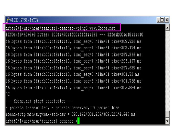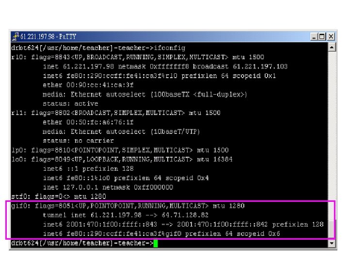 FREEBSD 5. 1 IPV 6 Tunnel Broker設定 1. ifconfig gif 0 create 2. ifconfig gif 0 tunnel 61. 221. 197. 98 64. 71. 128. 82 3. ifconfig gif 0 inet 6 2001: 470: 1 F 00: FFFF: : 843 2001: 470: 1 F 00: FFFF: : 842 prefixlen 128 4. route -n add -inet 6 default 2001: 470: 1 F 00: FFFF: : 842 5. ifconfig gif 0 up