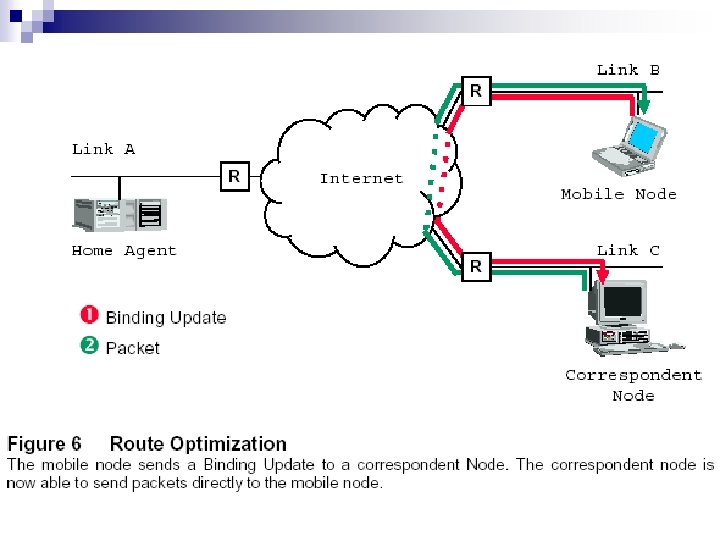 Mobile IPv 6 Operation n n 當MN移到另一個link時, 會以autoconfiguration去取得一IP, 之 後MN會送一 “binding update”給他的HA. (destination option) 之後HA會回一個 ”binding acknowledgement” 給MN. (destination option)