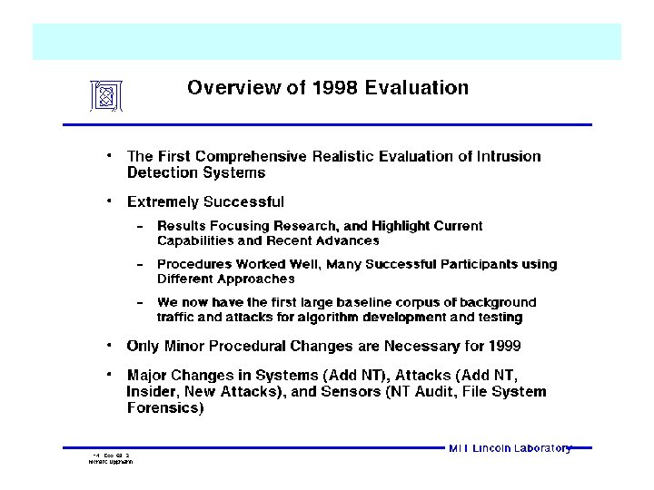 1998 DARPA Intrusion Detection Evaluation = Pentium II pcs running modified Linux kernel (based on 2. 0. 32) which allows these machines to spoof many different ip addresses Simulation Network for Off-line Evaluation “Outside” “Inside” 172. 16 => eyrie. af. mil hub A Solaris 2. 5. 1 Simulation Status Linux 2. 0. 27 Locke 172. 16. 112. 10 Marx 172. 16. 114. 50 Sun. OS 4. 1. 4 Solaris 2. 5. 1 Target Machines Zeno 172. 16. 113. 50 Pascal 172. 16. 112. 50 Inside Traffic Generator Hobbes 172. 16. 112. 20 Ethernet Hub Info A: Asante. Hub 1012 (no ip) B: HP Ether. Twist Hub PLUS (ip = 192. 168. 1. 5) Router Cisco AGS+ 192. 168. 1 => world. net 194. 27. 251 => plum. net 197. 218. 177 => grape. mil (plus all other domains used) B Sun. OS 5. 6 Outside Traffic Generator Web Server Calvin 192. 168. 1. 10 Aesop 192. 168. 1. 20 Sniffer Solomon 192. 168. 1. 90 Router Interface Info A: 172. 16. 112. 1 B: 198. 168. 1. 1 MIT Lincoln Laboratory dm: last modified 3/24/98