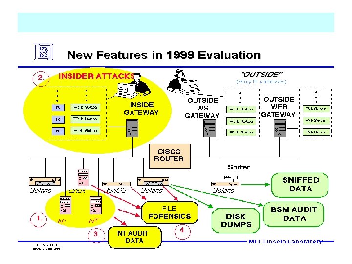 1999 DARPA Intrusion Detection Evaluation: : Simulation Network 99 Cisco 2514 Router CISCO 192. 168. 1. 1 172. 16. 0. 1 HP Linux Sun. OS Mac. OS 192. 168. 1. 2 plato HP 172. 16. 112. 5 Sun. OS Linux Solaris Sun. OS Linux NT Win 98 NT aesop calvin solomon monitor locke 192. 168. 1. 20 192. 168. 1. 10 192. 168. 1. 90 192. 168. 1. 30 172. 16. 112. 10 Web Server Gateway Sniffer SNMP Monitor Sniffer Linux attacker hobbes pascal zeno marx hume kant 172. 16. 112. 20 172. 16. 112. 50 172. 16. 113. 50 172. 16. 114. 50 172. 16. 112. 100 172. 16. 112. 110 Gateway Victim NT NT attacker 98 attacker . . . Virtual Outside Hosts attacker Virtual Inside Hosts Ethernet Hub Router Victim