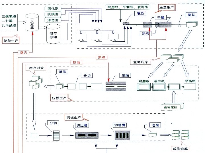 一)生产 艺流程 制胶----浸胶----组坯----压板----养生---割分----养生----开榫槽----分等----包装---入库