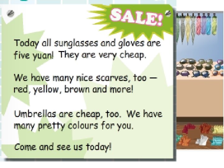 Hi! Mum! Many things are on sale. Really? What are they? They are sunglasses, gloves, scarves and the umbrellas.