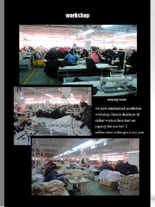 • Company Profile • Jiangsu Shengyang Apparel Co. , LTD was established in August, 2009, which covers 78588 square meters. There's series of modern and standardised factory area. We mainly operate export business on such commodities as jacket, cotton-padded, leisure shirt, beach shorts, sports wear etc, which enjoy popularity in China Taiwan , AUS, USA markets. • We owns lots of processing plants in Zhaxia and Huaian city. Presently, there’re over 200 skilled employees. And our pretax turnover has reached more than 43 million yuan. • More than 500 advanced production and processing equipments have been introduced from Japan and the product efficiency and annual output have nearly increased by 30%. • Our company adhere to the operation principle of quality, market, development and prestige. We’ll always do our best to make sure the customers are satisfied through normalized our service management. And of high quality. establishing a distinguished company’s image is our liability and goal.