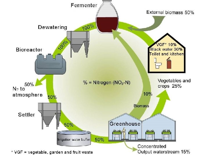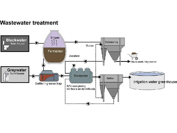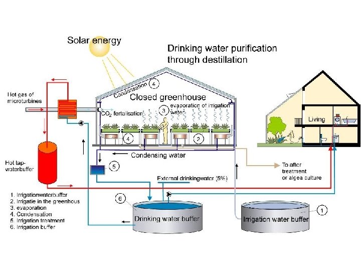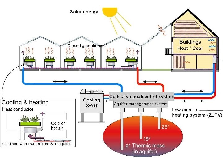 Greenhouse Village • Winter heat from aquifer, loaded by the greenhouse in summer, 100 house per hectare greenhouse in Dutch climate • All plant, kitchen, toilet waste goes to an anaerobic digester • Digester produces biogas = CO 2+CH 4 • CHP engine makes electricity, heat & electric power from this biogas, enough for greenhouse and houses • Condensate from fine wire heat exchangers is enough for drinking water for the houses • Waste water from houses is converted to irrigation for greenhouse, no extra fertilizer necessary.