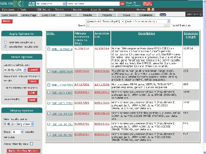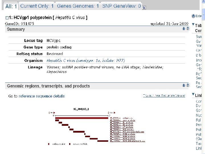 • For the Entrez query: hiv-1 pol • there about 80, 000 nucleotide or protein records (and >200, 000 records for a search for “hiv-1”), but these can easily be reduced in two easy steps: • --specify the organism, e. g. hiv-1[organism] • --limit the output to Ref. Seq!