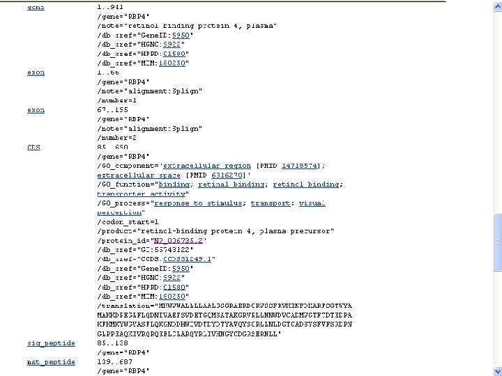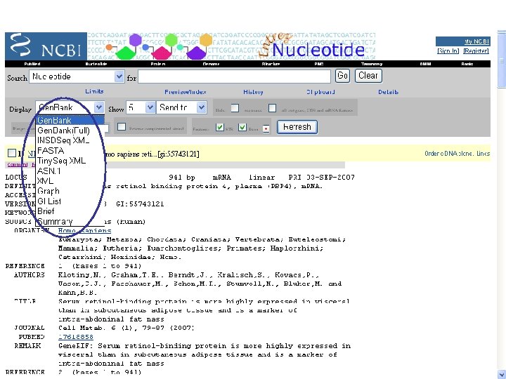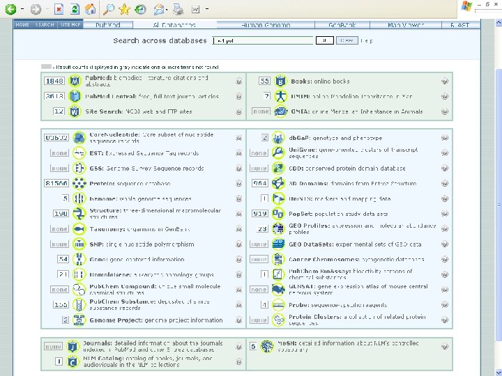 • All databases(Entrez) integrates… – the scientific literature; – DNA and protein sequence databases; – 3 D protein structure data; – population study data sets; – assemblies of complete genomes – ……