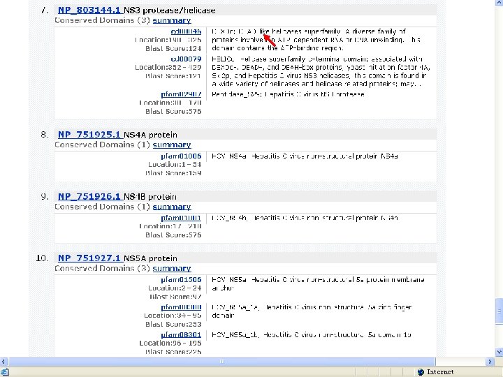• 针对HCV病毒的以上数据库查询为研究人 员带来如下启示: – HCV编码产物HCV gpl的非结构蛋白NS 3区为 保守区,与多种人类解旋酶具有同源性; – 其余各编码区未检测到与人类同源性; – 而解旋酶在细胞核参与核酸复制与DNA修复。 – 故针对HCV NS 3抗原的检测有可能与人类解旋 酶起交叉反应; – 宿主免疫系统针对NS 3蛋白产生免疫反应的同 时,有可能破坏自身的肝细胞结构。 • 对HCV病毒的上述发现提示:在丙型肝炎 疫苗设计以及临床检验试剂选择中应当避 开选择针对HCVgpl的NS 3序列。