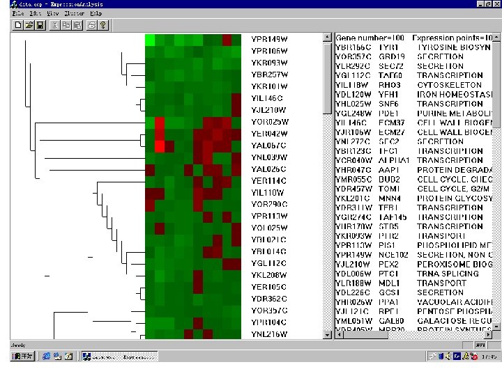 • 目前基因组功能研究的有基因表达分析系 统(serial analysis of gene expression, SAGE)、c. DNA微阵列(c. DNA microarray)、 DNA芯片(DNA chip)等技术, • 使用的方法有聚类,分类分析与模式识别、 几何分形等多元数据统计方法及代数的结 构分析的方法等 • 功能表达谱网络分析。