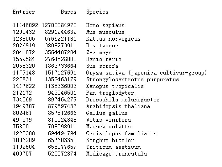 3. Gen. Bank中的物种数 • Over 300 000 named species are represented in Gen. Bank and new species are being added at the rate of over 2200 per month. • About 12% of the sequences in Gen. Bank are of human origin and 9% of all sequences are human ESTs. • The top species in Gen. Bank in terms of number of bases are Homo sapiens (13. 1 billion bases), Mus musculus (8. 4 billion), Rattus norvegicus (6. 0 billion), Bos taurus (5. 2 billion), Zea mays (4. 6 billion), Sus scrofa (3. 1 billion), Danio rerio (2. 9 billion), Oryza sativa (1. 5 billion), Strongylocentrotus purpuratus (1. 4 billion), Nicotania tabacum (1. 1 billion) and Xenopus tropicalis (1. 0 billion).