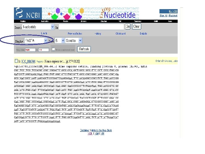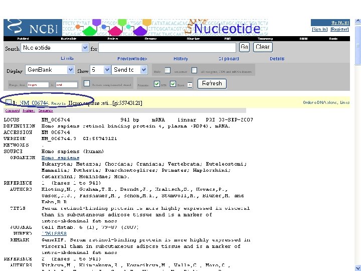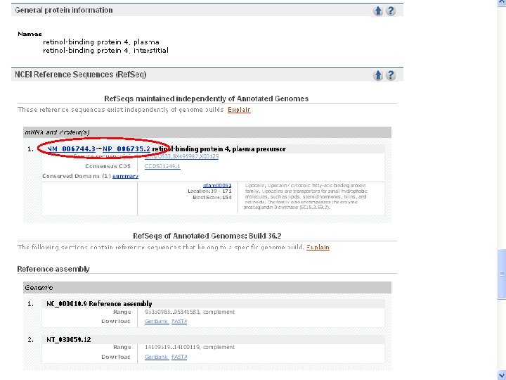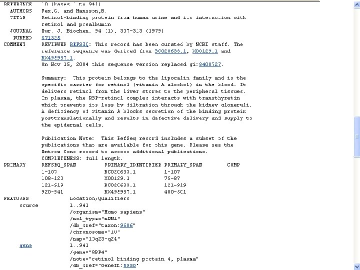 NCBI’s important Ref. Seq project: best representative sequences • Ref. Seq (accessible via the main page of NCBI) provides an expertly curated accession number that corresponds to the most stable, agreed-upon “reference” version of a sequence. • Ref. Seq identifiers include the following formats: • • • Complete genome NC_###### Complete chromosome NC_###### Genomic contig NT_###### m. RNA (DNA format) NM_###### e. g. NM_006744 Protein NP_###### e. g. NP_006735