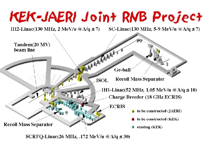 Facility Proposal 1999 - 2000: All the RNB instruments were moved to Tsukuba (no-primary beam accelerator) To rapid resume “Low-Energy RNB Science” including the nuclear physics, nuclear chemistry, nuclear astrophysics, material science, etc. It would be too late to start E-arena in JHF, whose construction will take at least 6 -7 years!! KEK-JAERI Joint RNB Facility • 5 -9 Me. V/u RNB will be available with using the existing S. C. Linac • Neutron-rich medium- and heavy-RNB can be supplied by the help of p-induced U-fission reaction. • Intense stable nuclear beam is also available independent from Tandem • Low Energy RNB center under the collaboration with KEK and JAERI