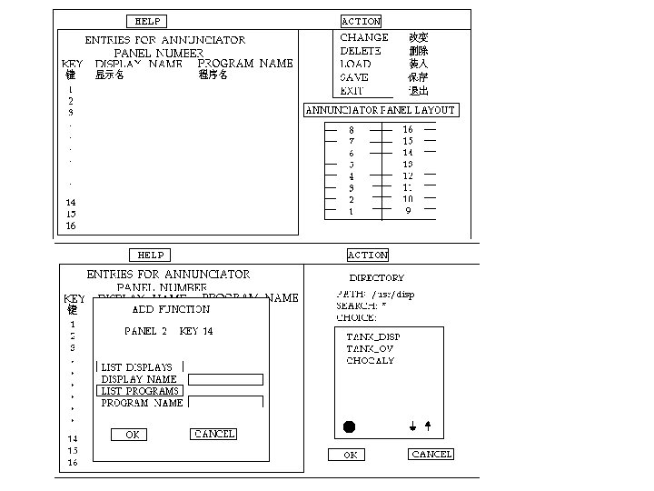 a. 选 OK 退回到 c. 组态其它键。 b. 一个 PANEL 组态好以后,选 ACTION → SAVE 将组态数据存盘,如果未存 盘就去组态其它 的PANEL,则前面的组态会丢失。 c. 如要组态其它 PANEL,回到 b. ,全部完成后选 ACTION → EXIT 退出组态器。