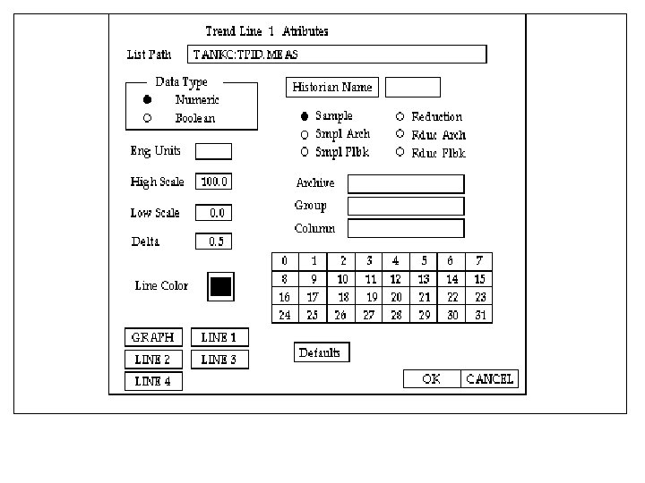 2. 3. 4 Trend 趋势线 这儿的趋势线组态与上一节(2. 3. 3 节)的趋势线组态基本相同, 其唯一 的差别就在于上一节 LINE 1 到 4 的变量名按模块名自动填入, 而这一节的 变量名需分别填写。 组态窗口和参数无任何区别