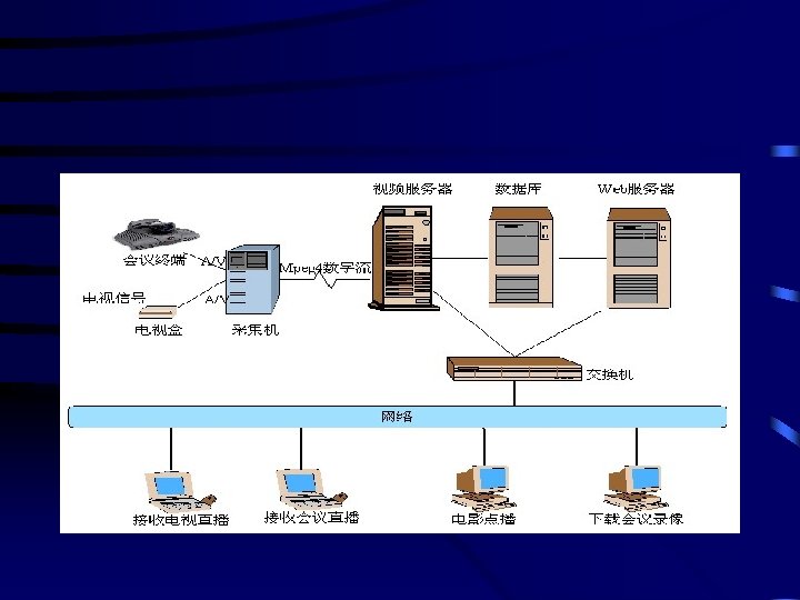 校园网视频点播、直播和广播 系统 • 系统支持B/S架构,支持安全认证,远程 管理,远程上传节目等功能,针对流媒 体在校园网中应用的特点,特别对系统 进行了优化,可以更方便的实现,课堂 直播、电视直播、以及课件、电影的点 播,广泛的应用在网络教学、校园电视 台、校园广播、校园监控、校园电影点 播中。