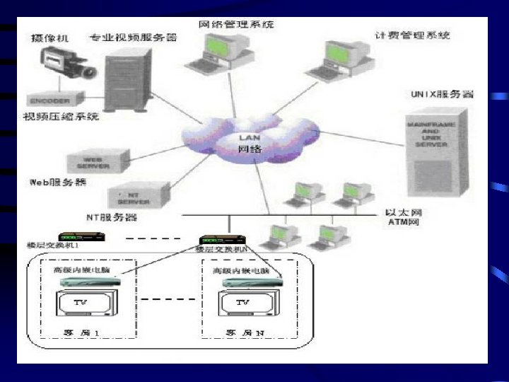 酒店VOD系统 • 酒店VOD(Video On Demand)系统,出现于90 年代中期。它是旅游服务业和现代计算机网络宽 带科技发展的产物。在国外VOD服务、信息服务 已广泛应用于各大星级酒店和高档住宅小区、娱 乐场所、有线电视台,成为其提高服务水准,增 加竞争力的必备设施。美国、日本普及率全在 90%以上,香港也在 80%以上。现代酒店顾客已 不止满足于视频点播的需要,还需要更多更方便 的信息服务。为顺应社会、科技的发展需要,我 们将具有VOD系统功能及能提供更多信息服务的 系统,统称为“客房信息服务系统HISS”。也便于 区别局限于单纯的VOD系统。