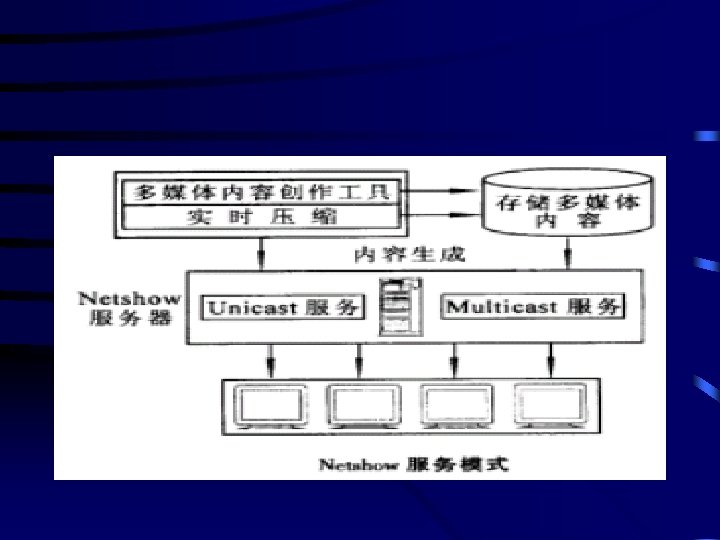 • 5) Net. Show Service是使用在中低带宽网络中 传输多媒体数据流,是一个纯软件环境,其主 要特点是: • ·支持Multicast,可以通过创建"站(Station)"来 建立Multicast通信。 • ·与视频音频压缩/解压缩方法相独立,通过 ASF(Active. Stream. Format)文件来实现压缩、解 压缩方法的自动下载。 • ·支持多种协议,包括TCP. UDP和HTTP. • ·提供了多媒体内容制作 具,包括实时视频音 频压缩 具,以及Netshow服务器管理器。