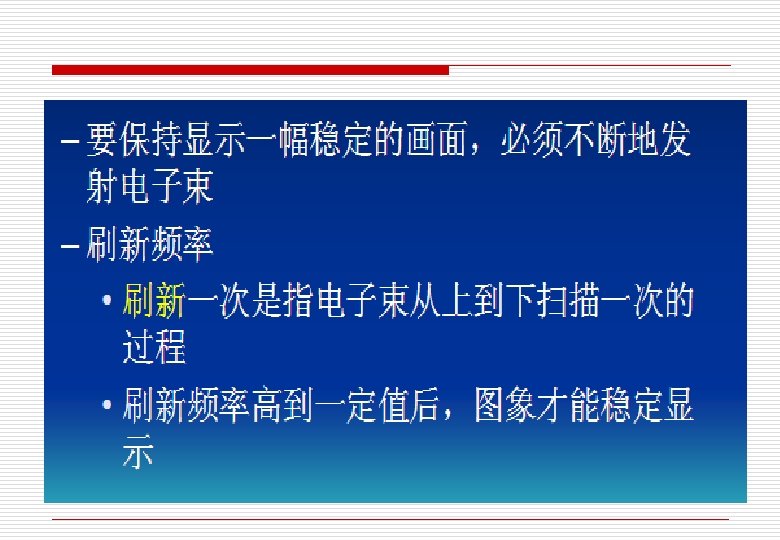o 分辨率(Resolution):CRT在水平或竖直方向单位长度 上能识别的最大像素个数,单位通常为dpi(dots per inch)。在假定屏幕尺寸一定的情况下,也可用整个屏 幕所能容纳的像素个数描述,如640*480,800*600, 1024*768,1280*1024等等 某种CRT产生稳定图像所需要的最小刷新频率 =1秒/荧光物质的持续发光时间 (例如)=1000/40=25 Hz