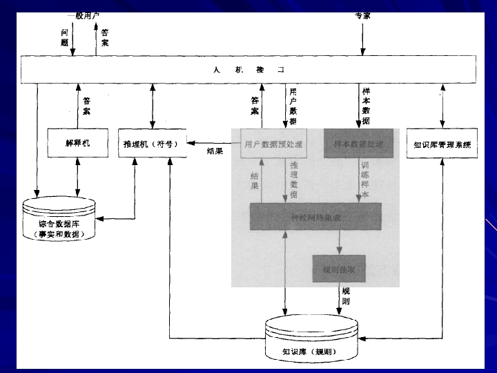 (2)系统模型及其 作原理 系统模型如下图所示,主要组成部分: ①基本部件:人机接口、知识库管理系统、推理机、 数据库、解释机; ②核心部件:神经网络集成。