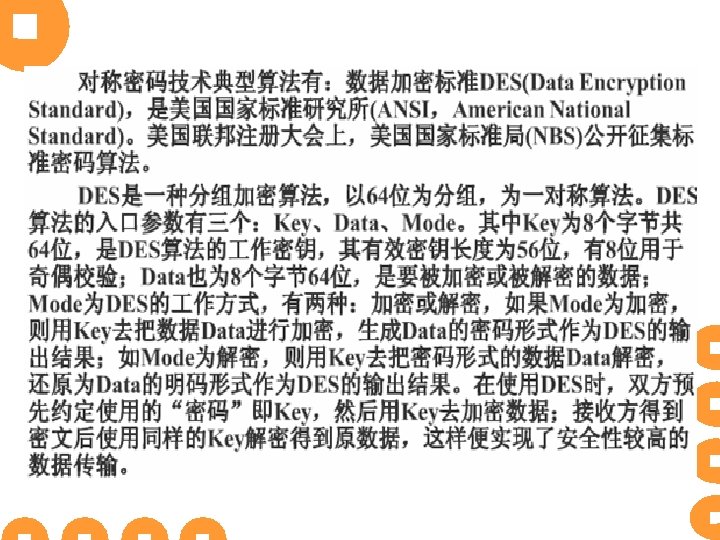 密钥的管理分配策略 ® ® ® ® 密钥的分配技术解决的是在网络环境中需要进行安全通信的 端实体之间建立共享的对称密钥问题。密钥的分发主要有人 密钥分发、基于中心的密钥分发、基于认证证书的分发。 1. 人 密钥分发是采用人 形式通过存储介质来交换传输 密钥,实现起来比较难于扩展,一般不提倡在网络系统使用。 不过,对于小规模网络来说也可以少量采取。 2. 基于中心的密钥分发(Kerberos认证协议) 基于中心的密钥分发主要是利用可信任的第三方进行密 钥的分发,主要是采取密钥分配中心方式KDC(Key Distribution Center)方式。比较典型的就是Kerberos。 3. 基于X. 509证书的PKI 4. Diffie-Hellman算法